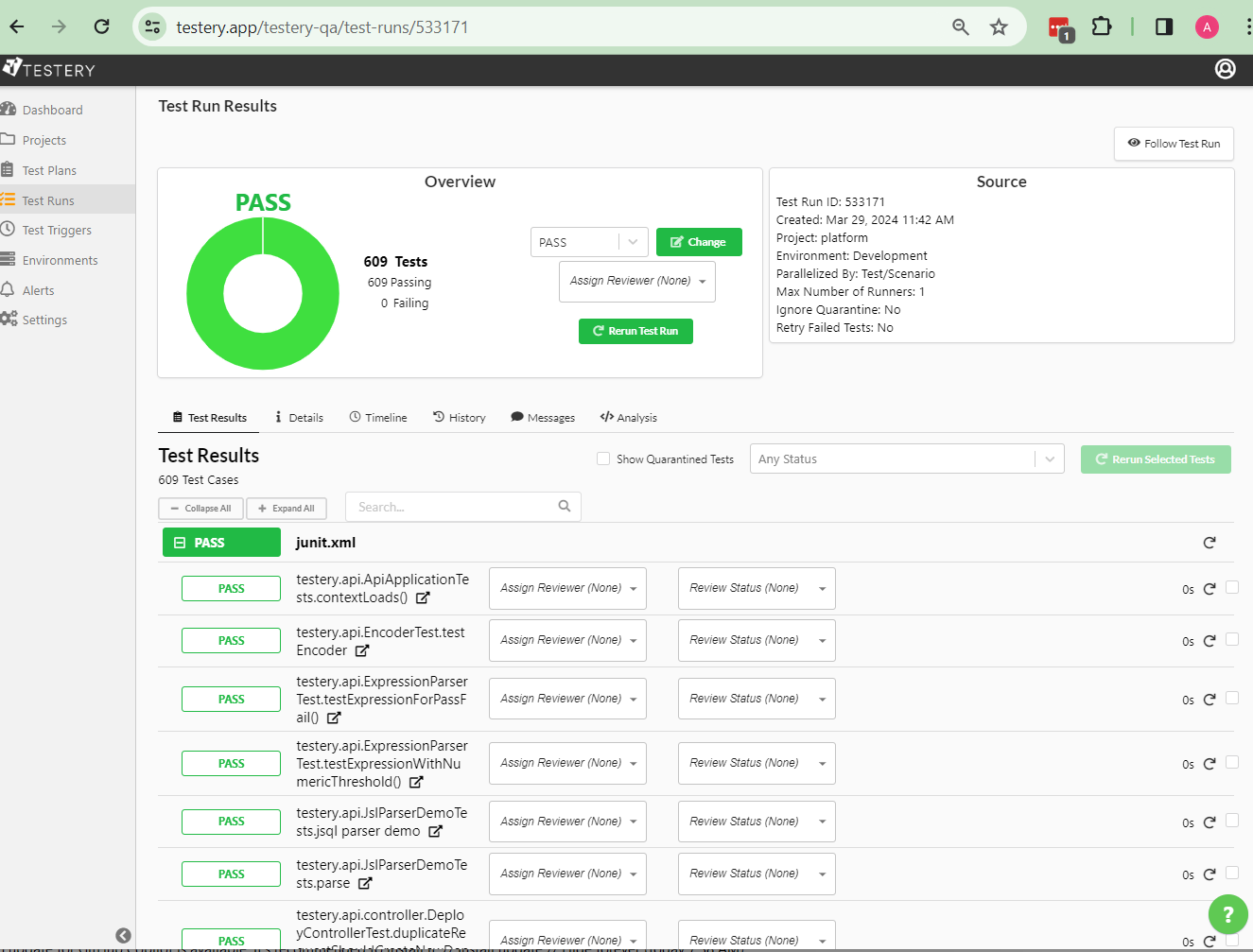 Once this succeeds, you'll have a new test run in your Testery account, and you'll be able to see your results in the familiar Testery UI.