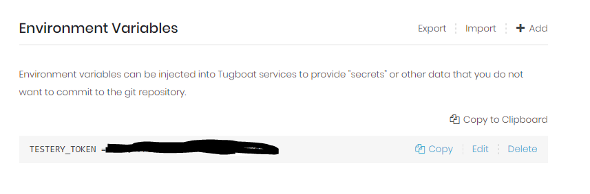 In Tugboat, go to your Repository Settings and add your Testery token as an Environment Variable. Be sure to use the same Environment Variable name that was used in Step 2 (we called it TESTERY_TOKEN).