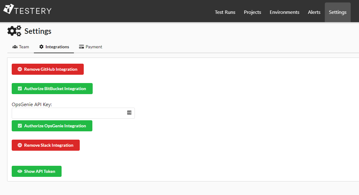 Get your Testery token by clicking on Settings -> Integrations -> Show API Token.