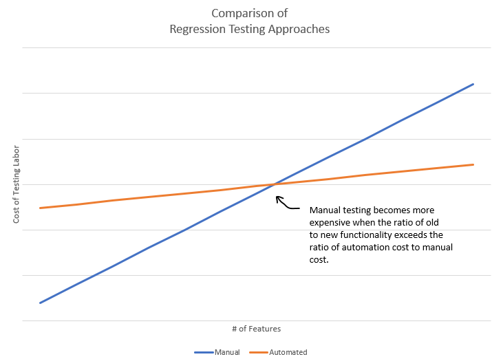 Manual tests generally have a lower initial implementation cost and a higher operating cost. So as the number of features being tested and the number of times the tests are being run increase, your tests will inevitably hit a point where automation is less expensive than manual testing.