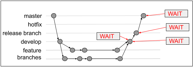 - Dev #2 waits 100 minutes for tests to complete from Dev #1 pushing to develop before he can push to develop. Even though this developer could in theory move on to another task, experience has shown that most likely he will be context switching between any new task and getting this feature into develop, thus reducing his efficiency.