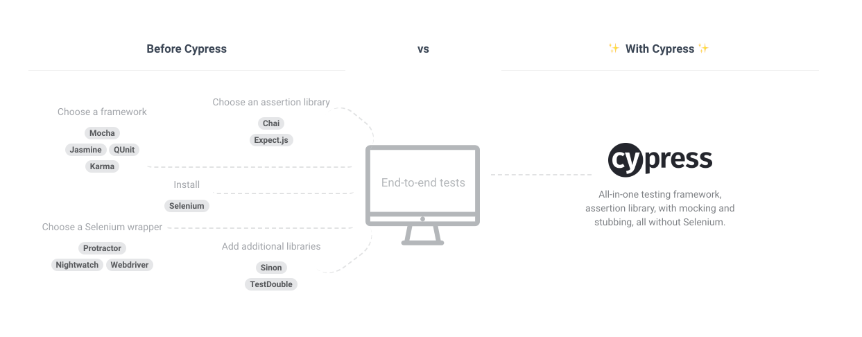 Pro: Cypress was built for developers and QA engineers with the intention of making it easy to test the UI. It can test anything that runs in a browser. With Cypress, you have to write your tests using javascript. If you are a front-end developer or know javascript this is fantastic! You can write tests in the same language as your code.