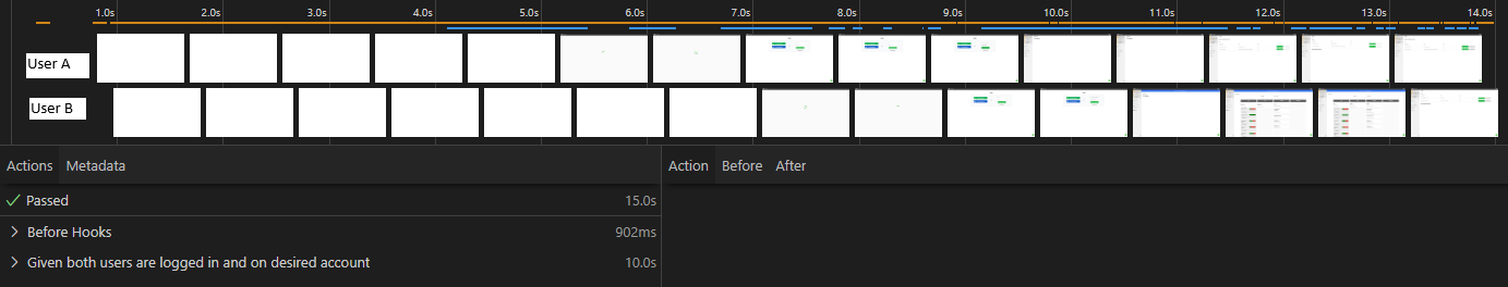 })This scenario is complete, but with these tools you can go even further. For example, if you want even more optimization try making flexible steps which take in which user you want as a step parameter and use page or pageTwo based on the user. This will help reduce duplicate code if running the same steps for different users. Or, if you wanted to verify a third user, that is now possible as well by adding another similar fixture.