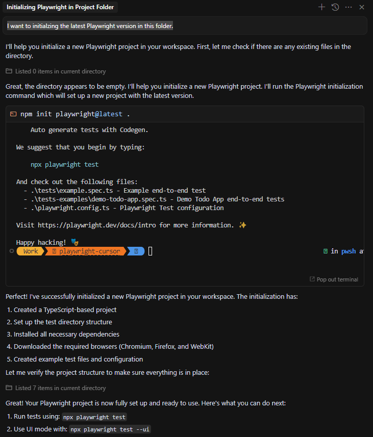 Creating an empty directory with the name "playwright-cursor", I gave the editor the prompt: I want to initialize the latest Playwright version in this folder. It successfully determined what I wanted and started the installation process and walkthrough for setting up a new Playwright project.