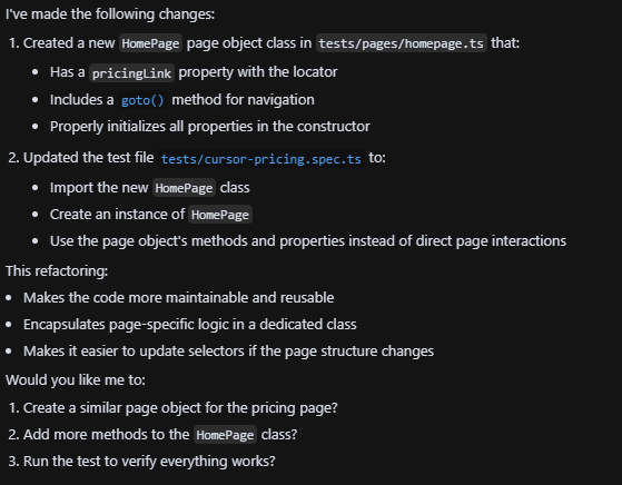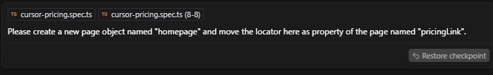 I gave the agent the highlighted locator as context and the prompt: Please create a new page object named "homepage" and move the locator here as property of the page named "pricingLink".