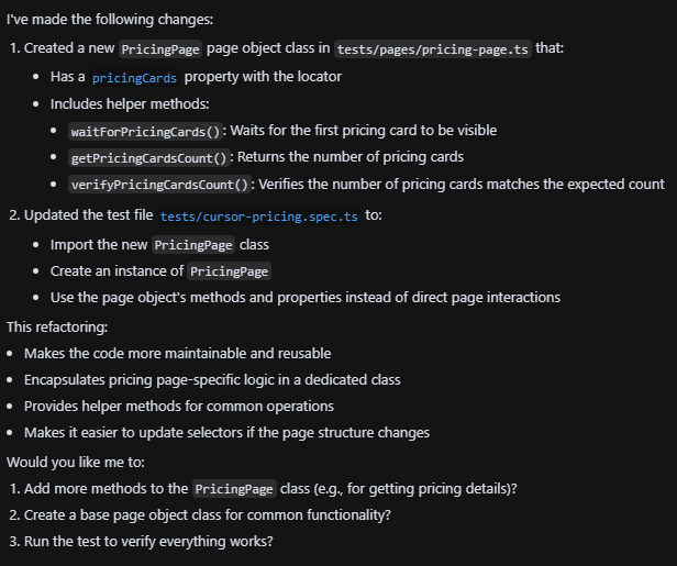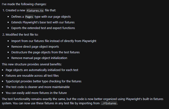 Finally, let's see if the AI can understand that I want to move the page initializations into Playwright fixtures.